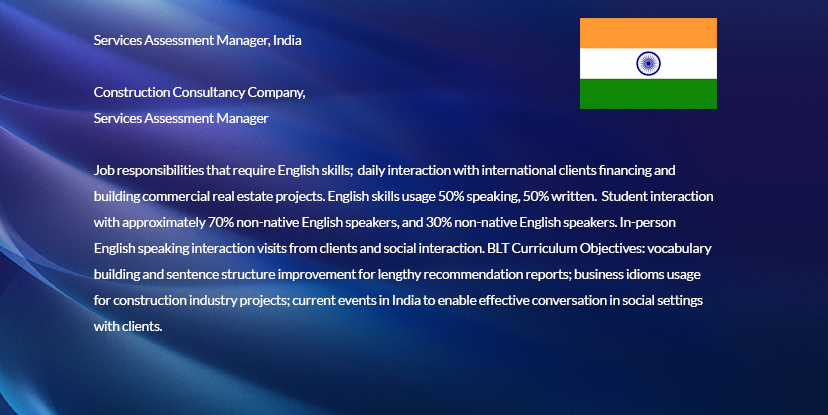 Through an individualized curriculum designed specifically for each student, BLT language training develops business people’s second language skills to accomplish 3 objectives: